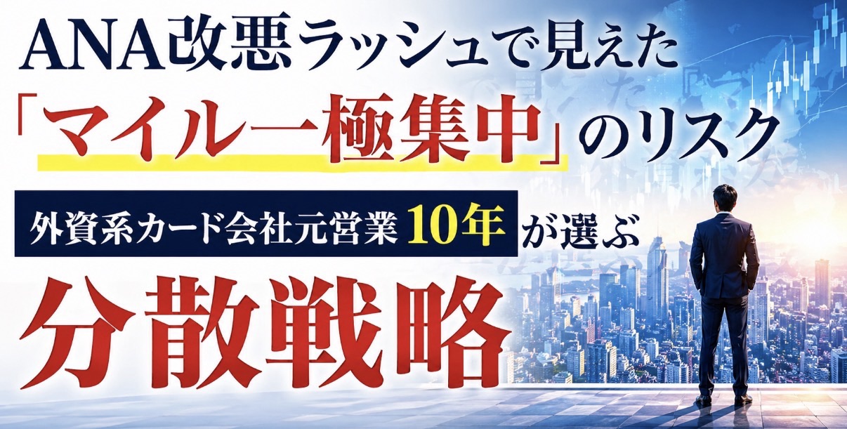 2026年4月、ANAから2つの大きな「改悪」報道が相次ぎました。1つ目はSFC(スーパーフライヤーズカード)の特典区分変更——年300万円未満の決済額ではラウンジ利用が不可になります。2つ目は国内線への燃油サーチャージ導入の検討。中東情勢悪化を背景に、2027年度の導入を視野に入れた検討が進んでいます。「陸マイラー」「SFC修行僧」の界隈はざわついていますが、本記事は修行ノウハウではなく、そもそもマイル一極集中というクレジットカード戦略そのものを見直すべき局面だと提起します。外資系カード会社で10年以上営業してきた私が、改悪に強い分散戦略をご提案します。