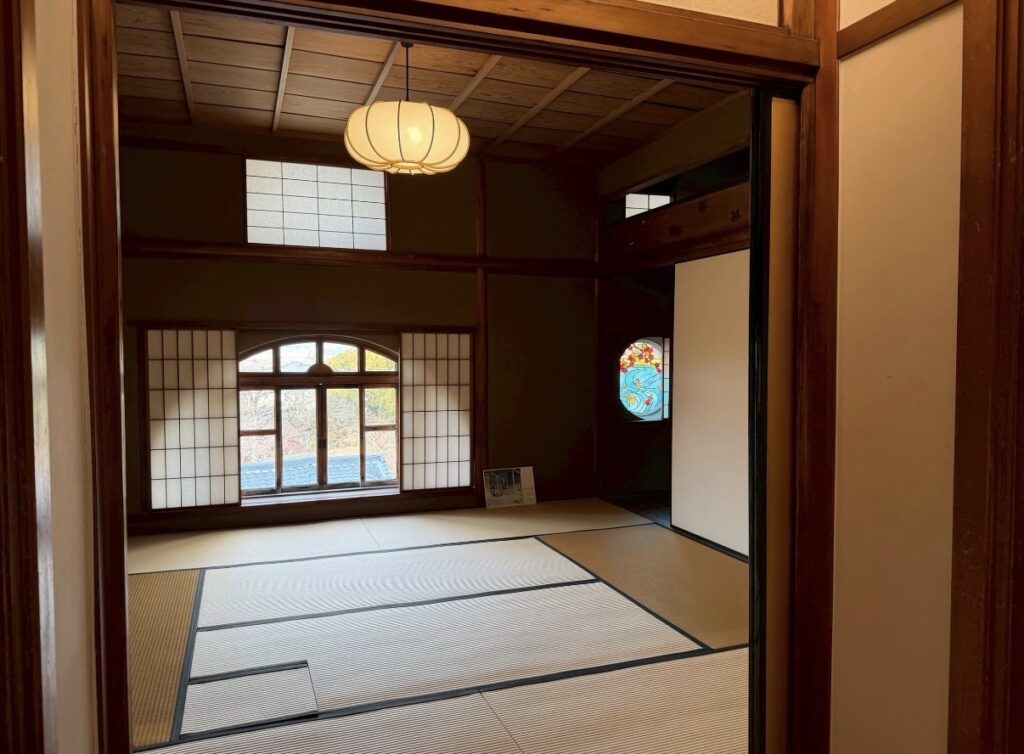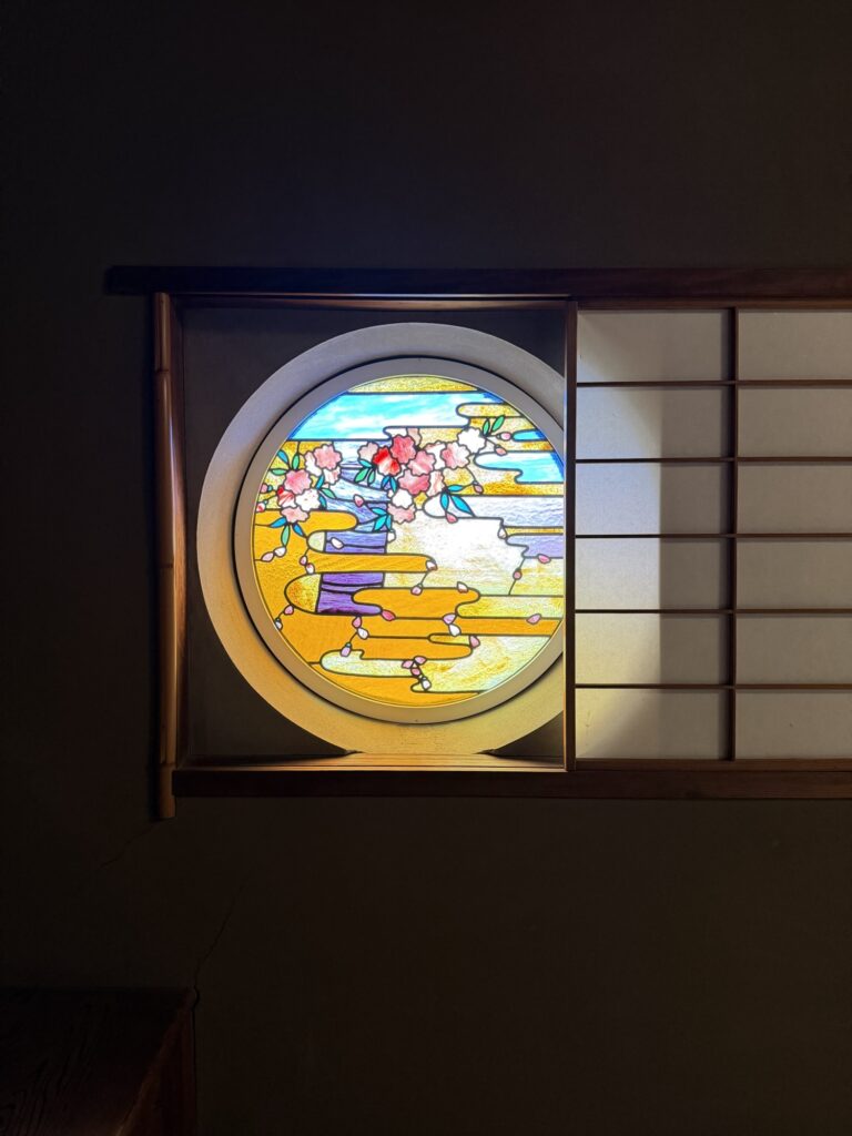 スタッフが案内してくれる本館3階の「御成の間」は、折上格天井・金銀砂子のふすま絵・バカラ社製クリスタルが融合した空間です。ロココ調の洋館の最上階にだけ、突然「格式高い和の世界」が現れます。この東洋と西洋が同居する構造は、当時の主人・村井吉兵衛の美意識と財力の証です。