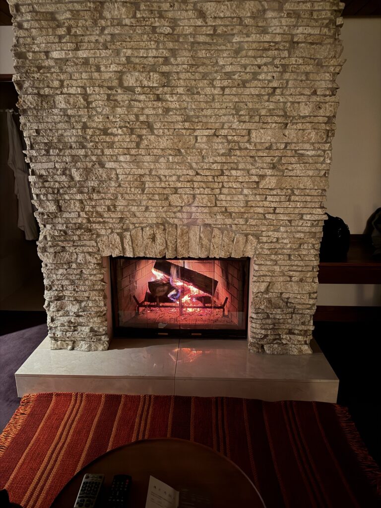 私が宿泊したのは少し肌寒い季節。チェックインして部屋に入ったとき、暖炉に火が入っていました。