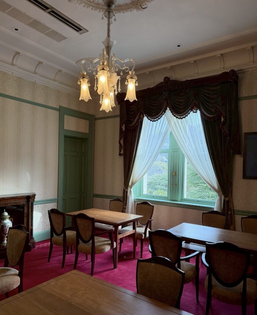 重要文化財の洋館のすぐ隣に、宿泊のための新館があります。宿泊することで、一般客には開放されていない本館の奥深いエリアに入れる——これが長楽館に泊まる本当の価値です。朝食前に長楽館を貸切状態で見学できます。(カフェ利用ができない時間帯かつ6組しか泊まっていないから)これが文化財好きには素敵すぎるサービスなのです。