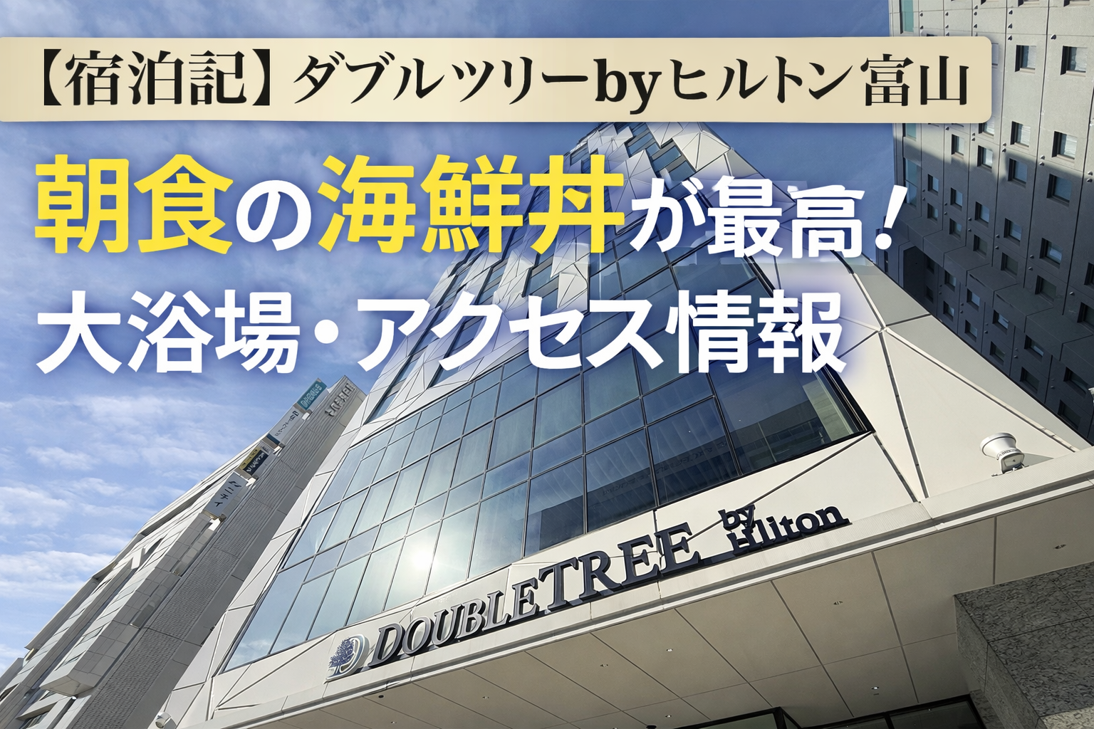 ダブルツリーbyヒルトン富山は、ラウンジこそないものの、大浴場・サウナ・海鮮朝食が揃った実用性の高いホテルです。富山駅徒歩3分のアクセスも◎。