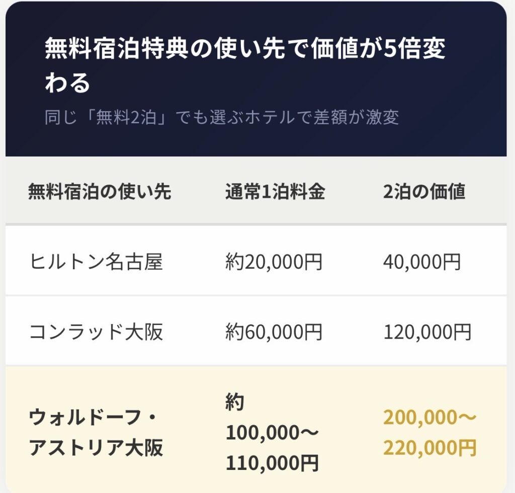 同じ「無料宿泊2泊」を使っても、ヒルトン名古屋なら4万円分、ウォルドーフなら20万円超。選ぶホテルだけで5倍の差が出る。