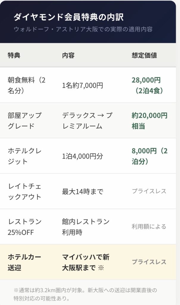 最後のマイバッハ送迎について正直に書く。ウォルドーフ・アストリアのホテルカー(メルセデス・マイバッハ)は、公式にはホテルから約2マイル(約3.2km)圏内の無料送迎とされている。新大阪駅はホテルから約5kmなので、本来は圏外だ。